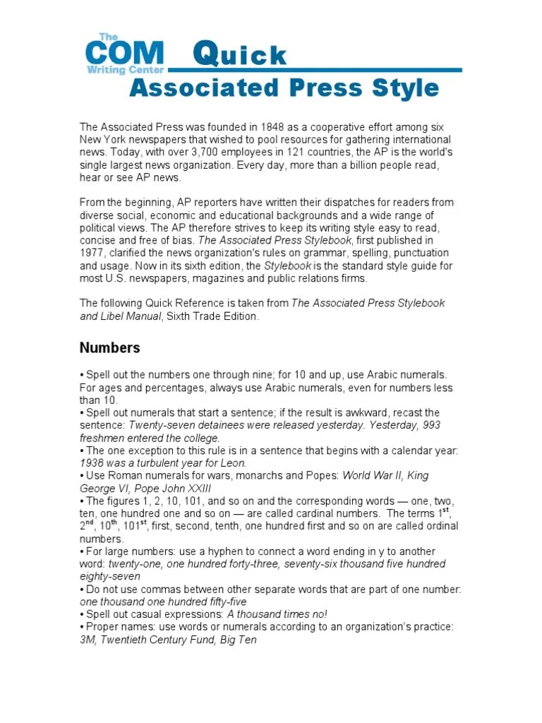 Web ap stylebook | the associated press. Find out how to use numbers, dates,. Below you’ll find information on numbers, time and dates, locations, phone numbers, punctuation,. Web learn the basics of ap style, the industry standard for journalism and news writing. Web this article is a summary of ap style.