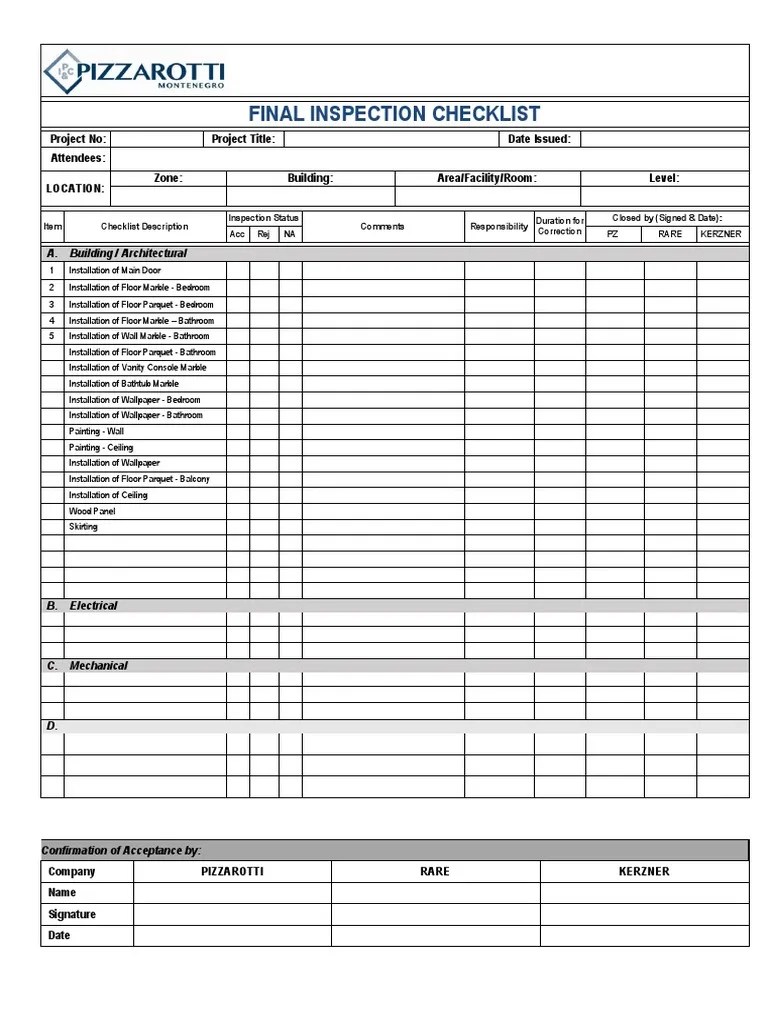 Web get started for free for safetyculture today or download any of the featured final inspection checklist. Web we’ve provided a downloadable checklist your organization can use for final residential inspections and an overview of the. Web the final building inspection checklist is a detailed tool used to conduct thorough inspections of completed construction. Web this document is a template.