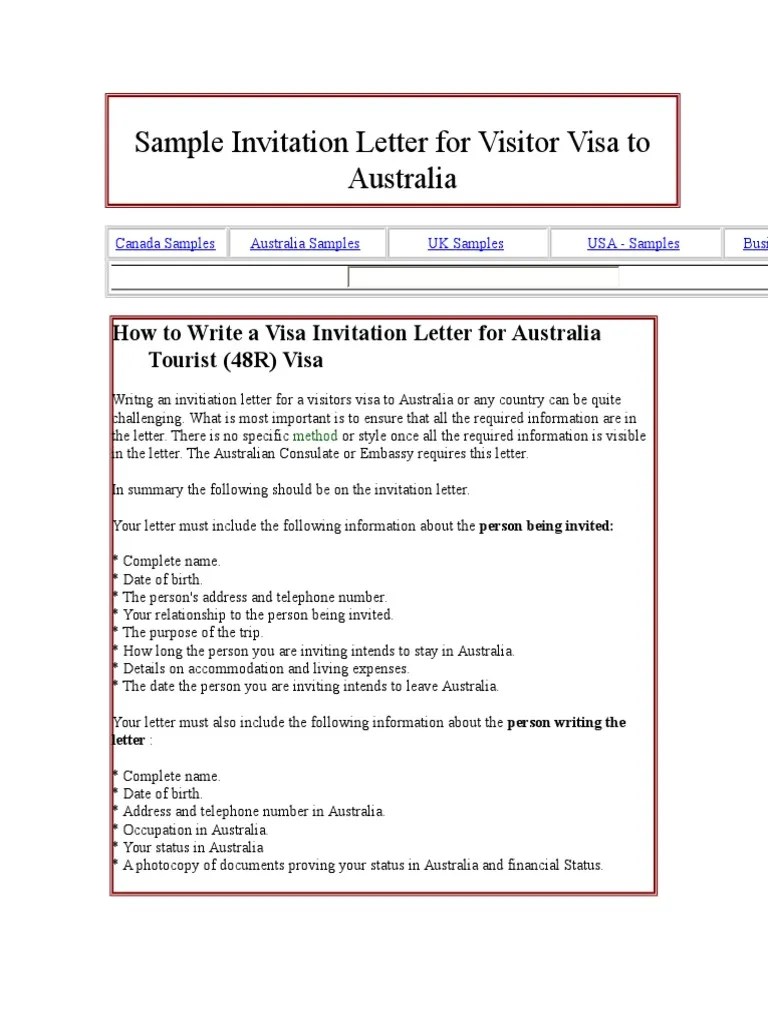 Sample Invitation Letter for Visitor Visa to Australia Travel Visa