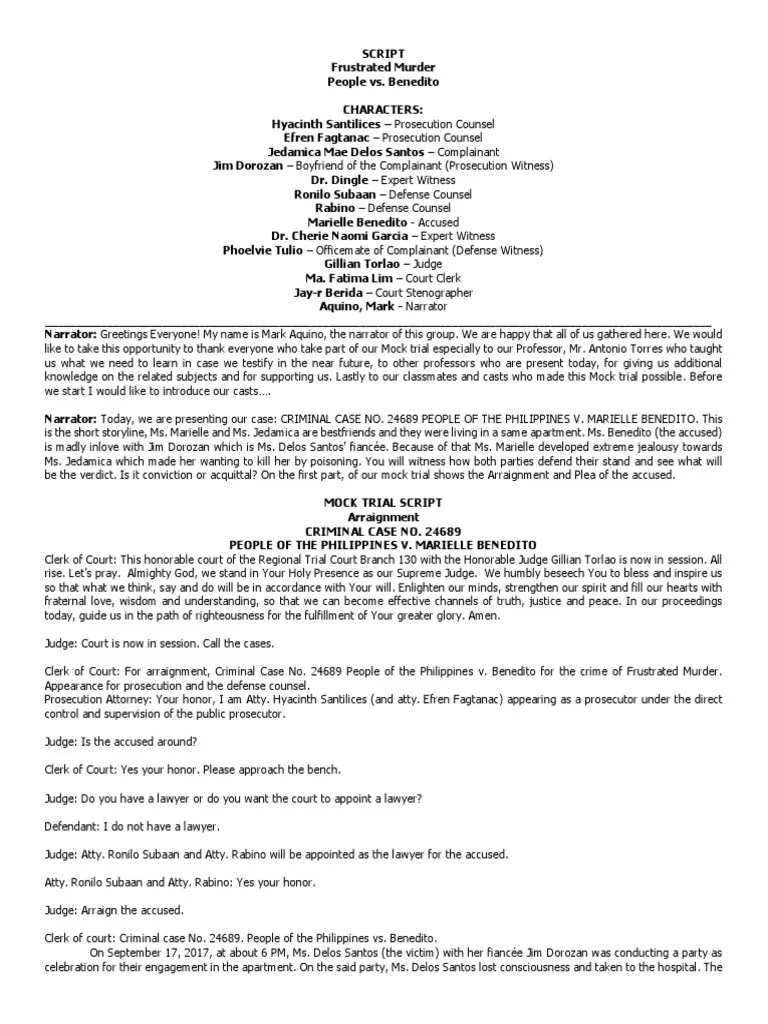 Refer to the time limitations in your mock trial packet and adjust your summary accordingly.] anticipate the defense. This mock trial outline includes a script for an imitation trial that can cover your bases if you hope to implement a script. They include formats for opening statements, direct. 16 mock trial judging form 17 selecting, preparing, and using judges 18.
