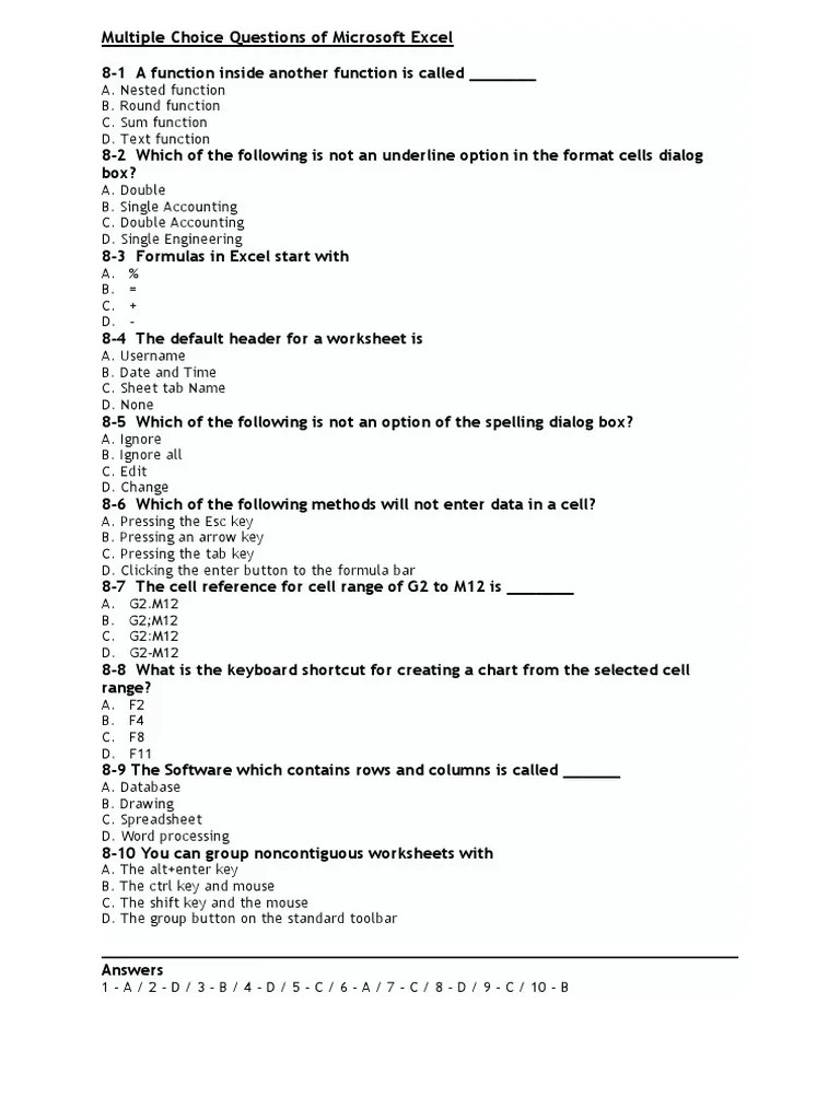 Multiple Choice Questions of Microsoft Excel PDF Spreadsheet