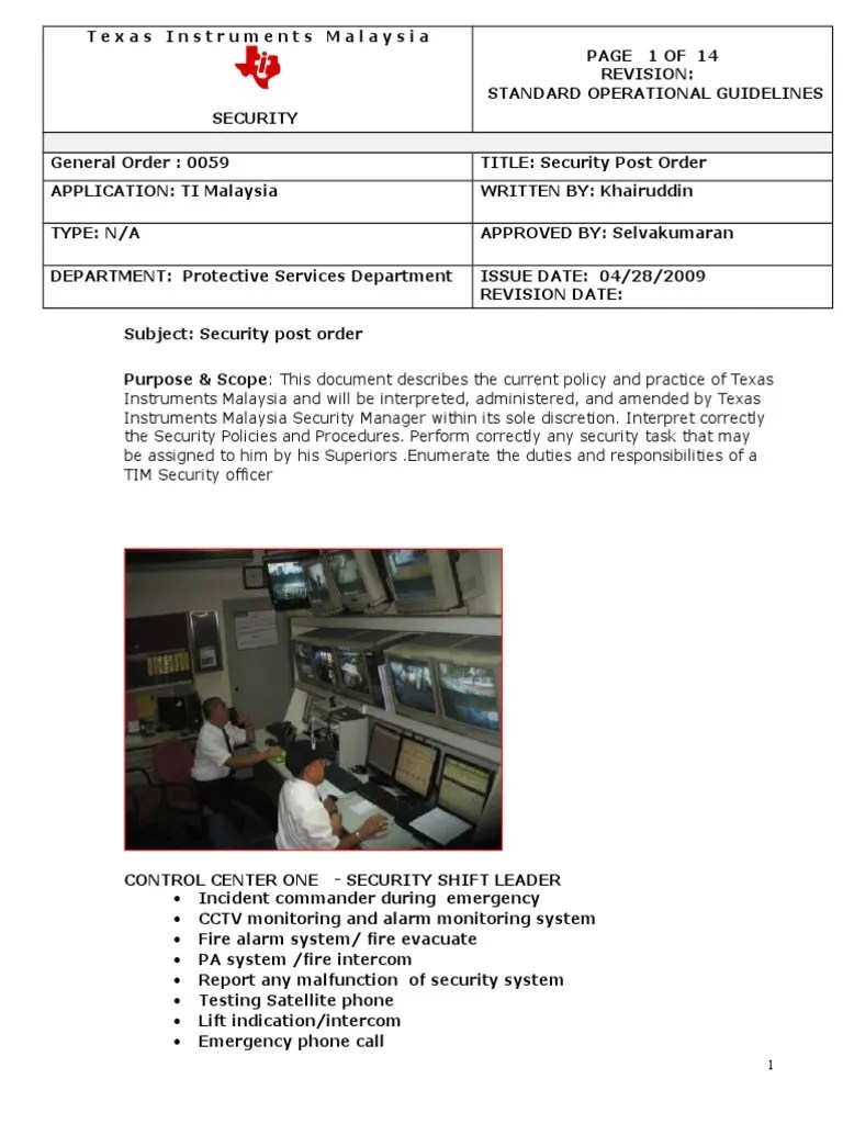 Example Outline Of Security Post Order And Standard Operating Procedures.